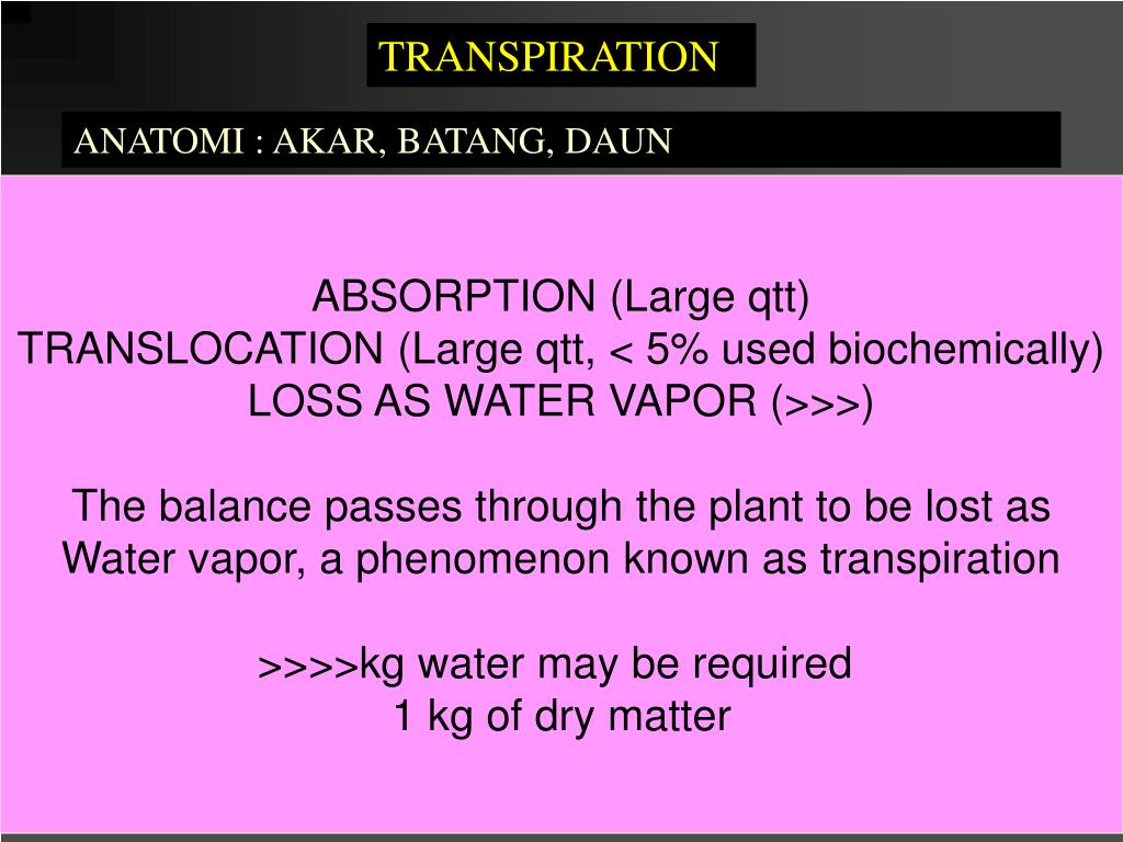 TRANSPIRATION ANATOMI : AKAR, BATANG, DAUN ABSORPTION (Large qtt) TRANSLOCATION (Large qtt, < 5% used biochemically) LOSS AS WATER VAPOR (>>>) The balance passes through the plant to be lost as Water vapor, a phenomenon known as transpiration >>>>kg water may be required 1 kg of dry matter