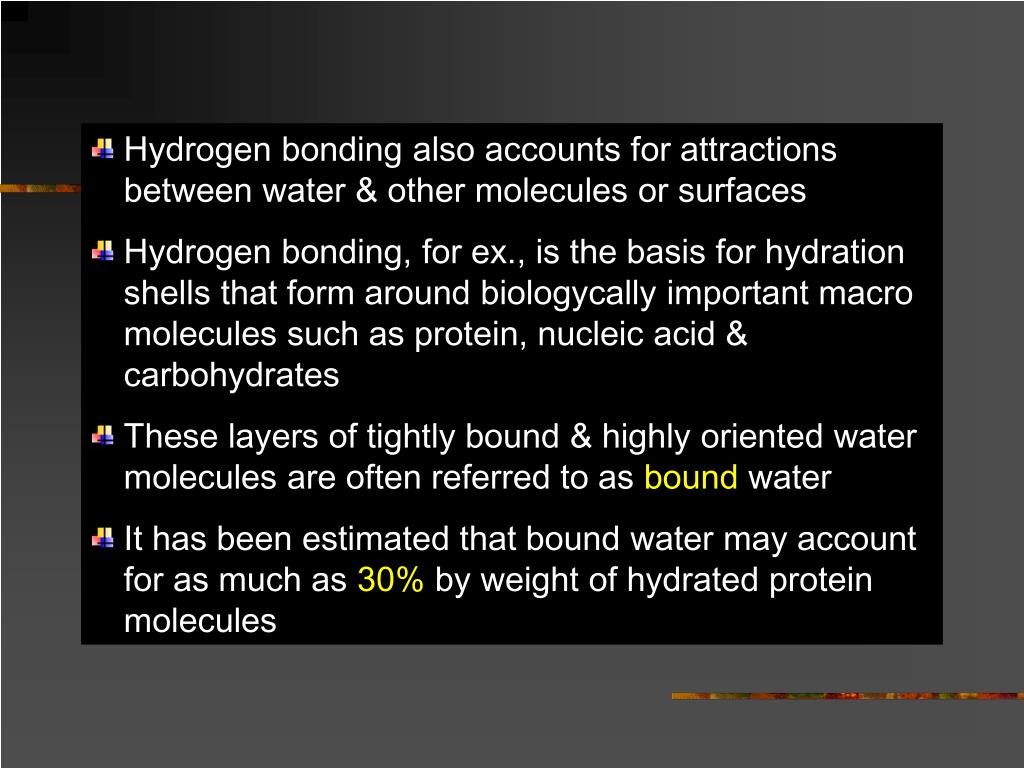 Hydrogen bonding also accounts for attractions between water & other molecules or surfaces • Hydrogen bonding, for ex., is the basis for hydration shells that form around biologycally important macro molecules such as protein, nucleic acid & carbohydrates • These layers of tightly bound & highly oriented water molecules are often referred to asboundwater • It has been estimated that bound water may account for as much as30%by weight of hydrated protein molecules