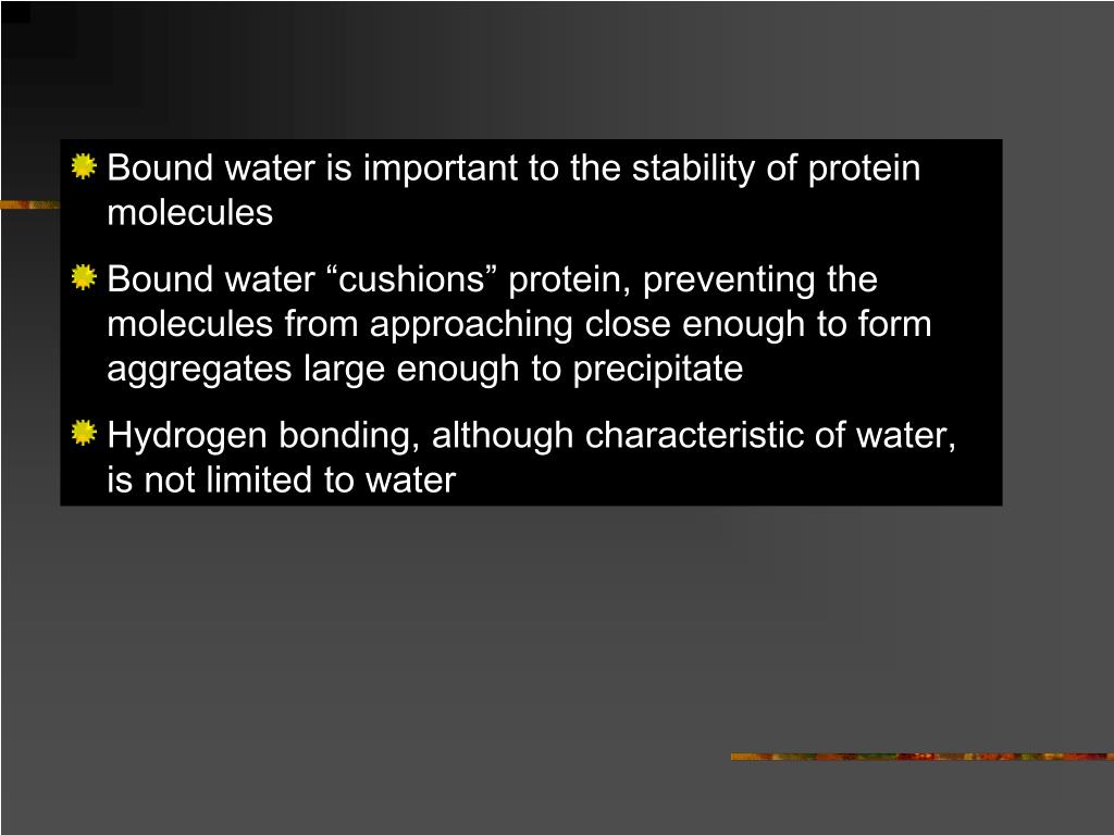 Bound water is important to the stability of protein molecules • Bound water “cushions” protein, preventing the molecules from approaching close enough to form aggregates large enough to precipitate • Hydrogen bonding, although characteristic of water, is not limited to water
