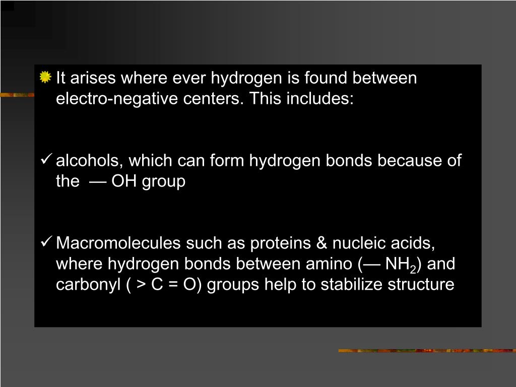 It arises where ever hydrogen is found between electro-negative centers. This includes: • alcohols, which can form hydrogen bonds because of the — OH group • Macromolecules such as proteins & nucleic acids, where hydrogen bonds between amino (— NH2) and carbonyl ( > C = O) groups help to stabilize structure