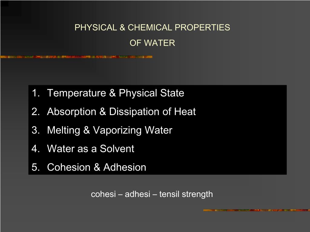 PHYSICAL & CHEMICAL PROPERTIES OF WATER • Temperature & Physical State • Absorption & Dissipation of Heat • Melting & Vaporizing Water • Water as a Solvent • Cohesion & Adhesion cohesi – adhesi – tensil strength