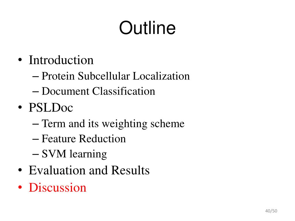 Outline • Introduction • Protein Subcellular Localization • Document Classification • PSLDoc • Term and its weighting scheme • Feature Reduction • SVM learning • Evaluation and Results • Discussion