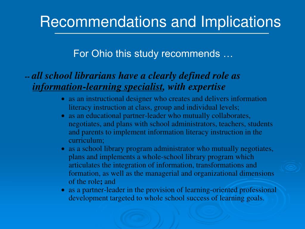 Recommendations and Implications For Ohio this study recommends … -- all school librarians have a clearly defined role as information-learning specialist, with expertise as an instructional designer who creates and delivers information literacy instruction at class, group and individual levels; as an educational partner-leader who mutually collaborates, negotiates, and plans with school administrators, teachers, students and parents to implement information literacy instruction in the curriculum; as a school library program administrator who mutually negotiates, plans and implements a whole-school library program which articulates the integration of information, transformations and formation, as well as the managerial and organizational dimensions of the role; and as a partner-leader in the provision of learning-oriented professional development targeted to whole school success of learning goals.