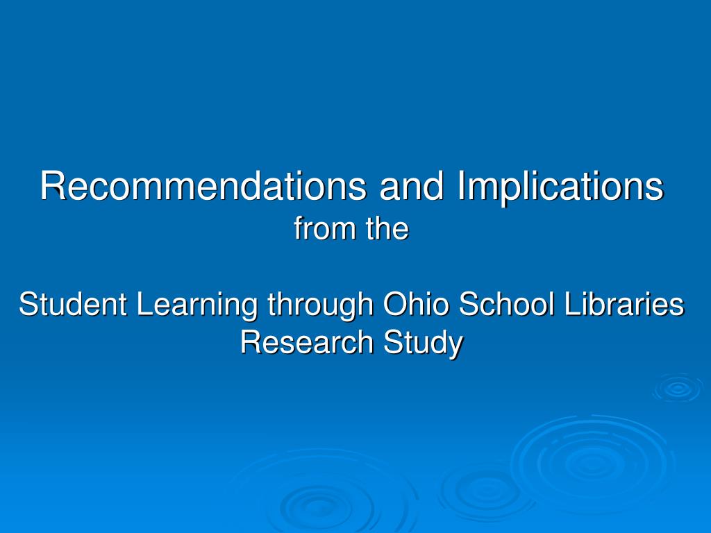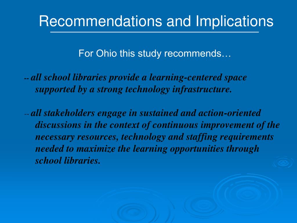 Recommendations and Implications For Ohio this study recommends… -- all school libraries provide a learning-centered space supported by a strong technology infrastructure. -- all stakeholders engage in sustained and action-oriented discussions in the context of continuous improvement of the necessary resources, technology and staffing requirements needed to maximize the learning opportunities through school libraries.