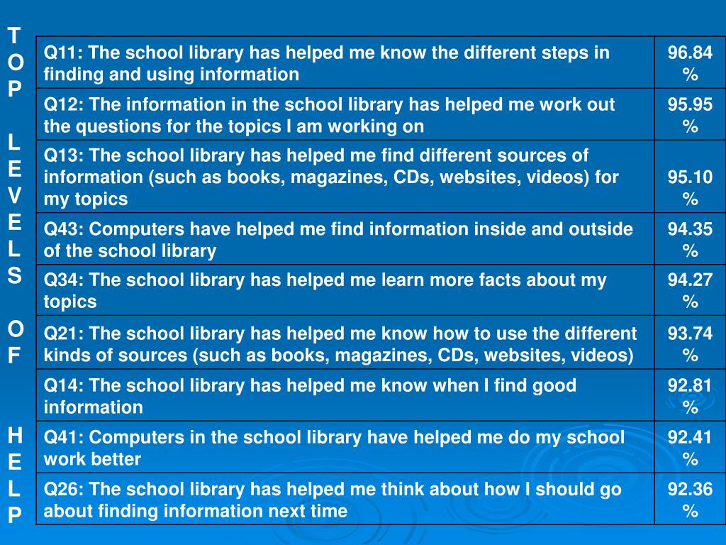 Q11: The school library has helped me know the different steps in finding and using information 96.84% Q12: The information in the school library has helped me work out the questions for the topics I am working on 95.95% Q13: The school library has helped me find different sources of information (such as books, magazines, CDs, websites, videos) for my topics 95.10% Q43: Computers have helped me find information inside and outside of the school library 94.35% Q34: The school library has helped me learn more facts about my topics 94.27% Q21: The school library has helped me know how to use the different kinds of sources (such as books, magazines, CDs, websites, videos) 93.74% Q14: The school library has helped me know when I find good information 92.81% Q41: Computers in the school library have helped me do my school work better 92.41% Q26: The school library has helped me think about how I should go about finding information next time 92.36% T O P L E V E L S O F H E L P