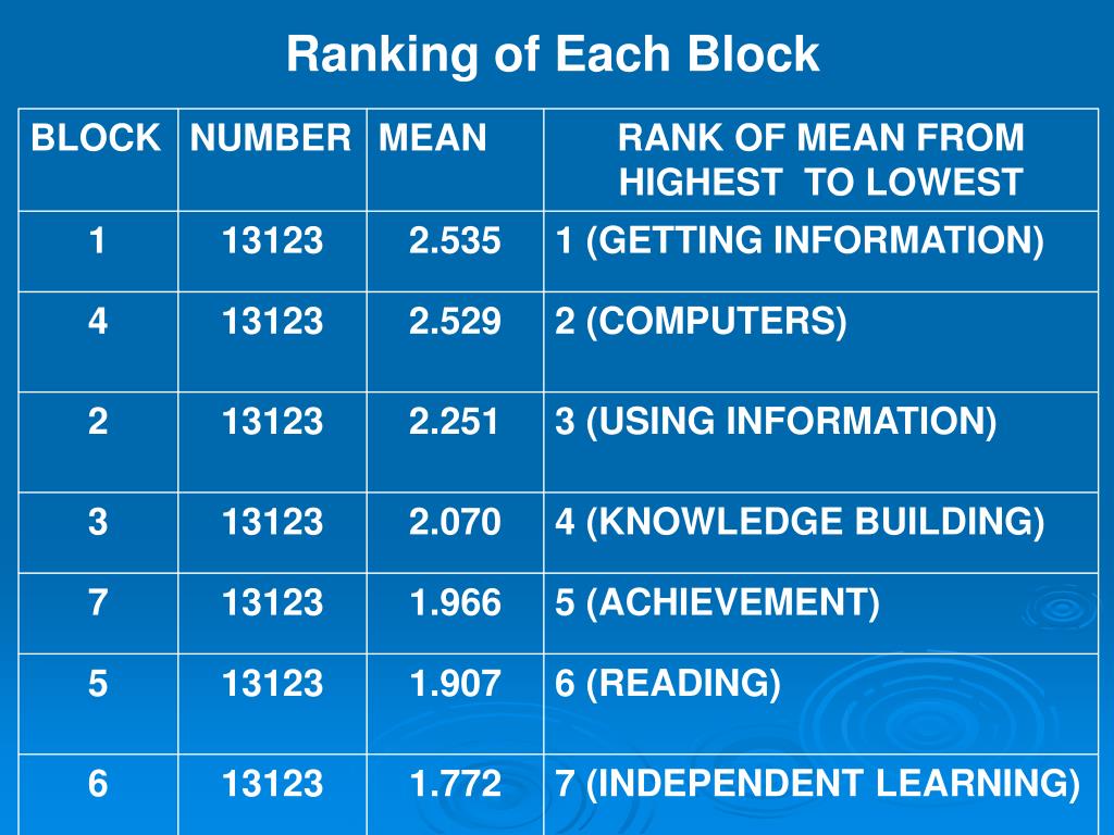 BLOCK NUMBER MEAN RANK OF MEAN FROM HIGHEST TO LOWEST 1 13123 2.535 1 (GETTING INFORMATION) 4 13123 2.529 2 (COMPUTERS) 2 13123 2.251 3 (USING INFORMATION) 3 13123 2.070 4 (KNOWLEDGE BUILDING) 7 13123 1.966 5 (ACHIEVEMENT) 5 13123 1.907 6 (READING) 6 13123 1.772 7 (INDEPENDENT LEARNING) Ranking of Each Block