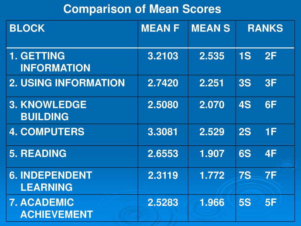 Comparison of Mean Scores BLOCK MEAN F MEAN S RANKS 1. GETTING INFORMATION 3.2103 2.535 1S 2F 2. USING INFORMATION 2.7420 2.251 3S 3F 3. KNOWLEDGE BUILDING 2.5080 2.070 4S 6F 4. COMPUTERS 3.3081 2.529 2S 1F 5. READING 2.6553 1.907 6S 4F 6. INDEPENDENT LEARNING 2.3119 1.772 7S 7F 7. ACADEMIC ACHIEVEMENT 2.5283 1.966 5S 5F