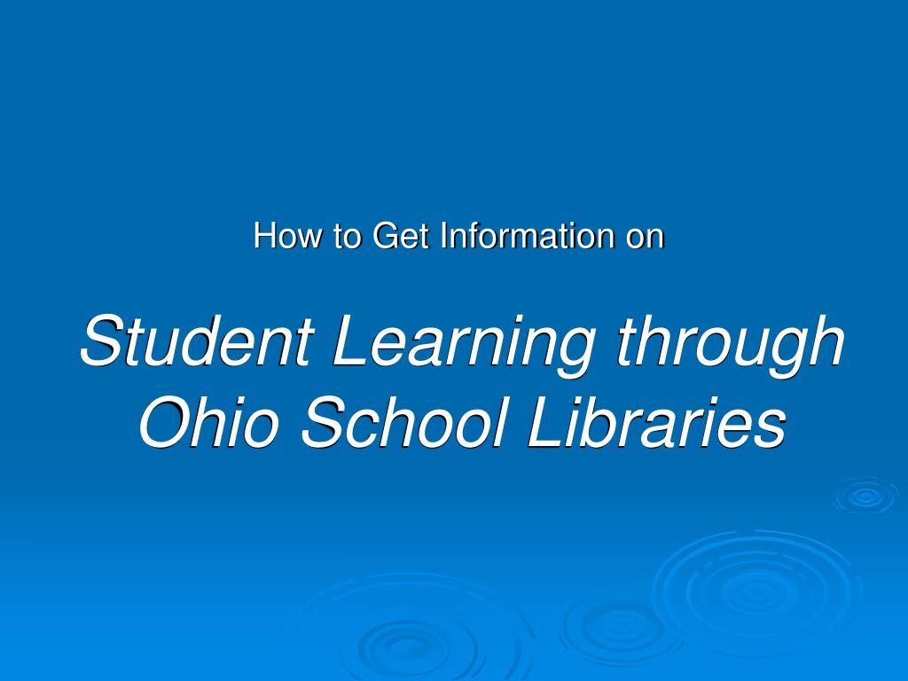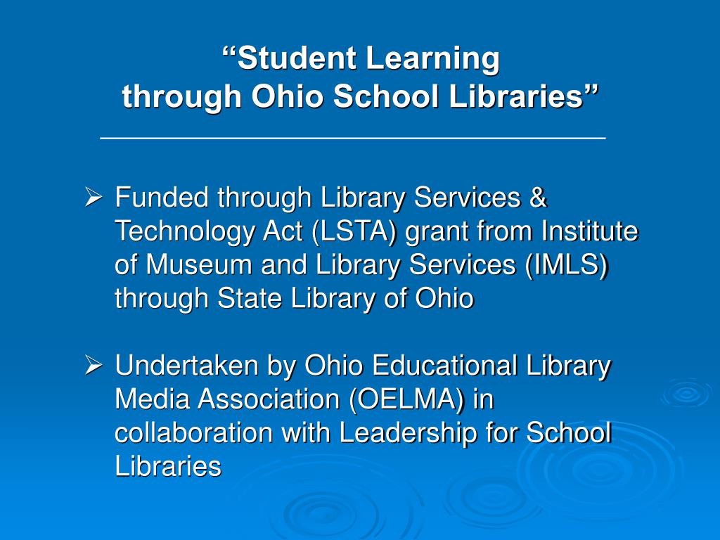 “Student Learning through Ohio School Libraries” • Funded through Library Services & Technology Act (LSTA) grant from Institute of Museum and Library Services (IMLS) through State Library of Ohio • Undertaken by Ohio Educational Library Media Association (OELMA) in collaboration with Leadership for School Libraries