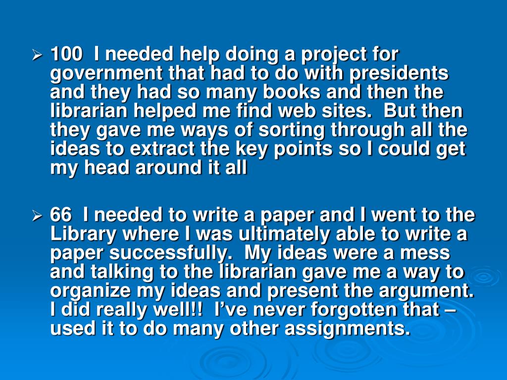100 I needed help doing a project for government that had to do with presidents and they had so many books and then the librarian helped me find web sites. But then they gave me ways of sorting through all the ideas to extract the key points so I could get my head around it all • 66 I needed to write a paper and I went to the Library where I was ultimately able to write a paper successfully. My ideas were a mess and talking to the librarian gave me a way to organize my ideas and present the argument. I did really well!! I’ve never forgotten that – used it to do many other assignments.