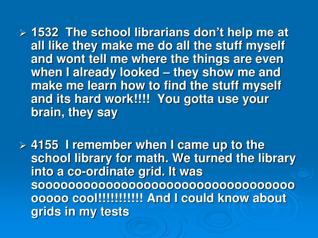 1532 The school librarians don’t help me at all like they make me do all the stuff myself and wont tell me where the things are even when I already looked – they show me and make me learn how to find the stuff myself and its hard work!!!! You gotta use your brain, they say • 4155 I remember when I came up to the school library for math. We turned the library into a co-ordinate grid. It was sooooooooooooooooooooooooooooooooooooooo cool!!!!!!!!!!! And I could know about grids in my tests