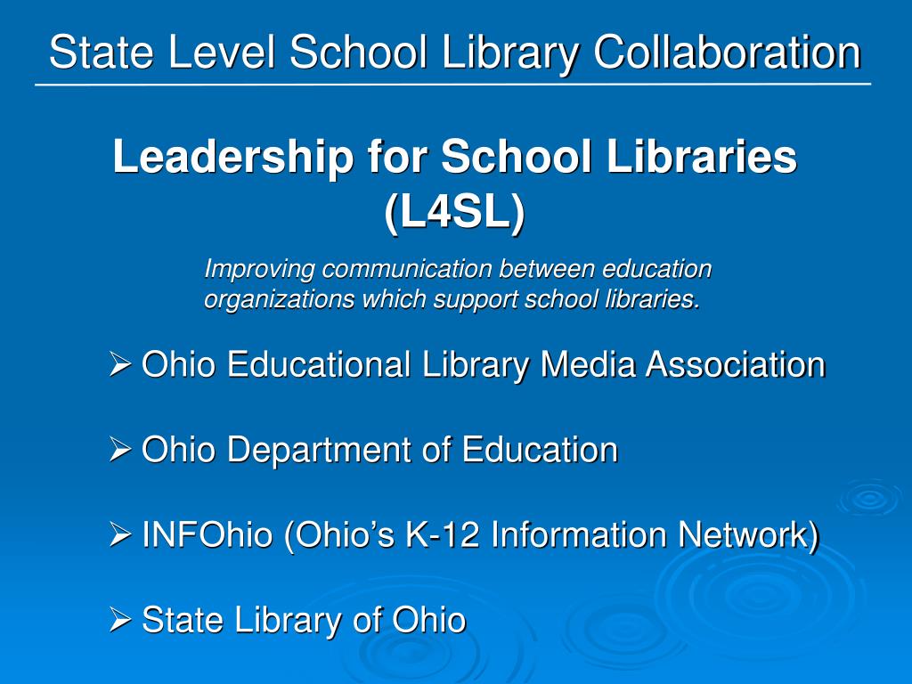 State Level School Library Collaboration Leadership for School Libraries (L4SL) Improving communication between education organizations which support school libraries. • Ohio Educational Library Media Association • Ohio Department of Education • INFOhio (Ohio’s K-12 Information Network) • State Library of Ohio