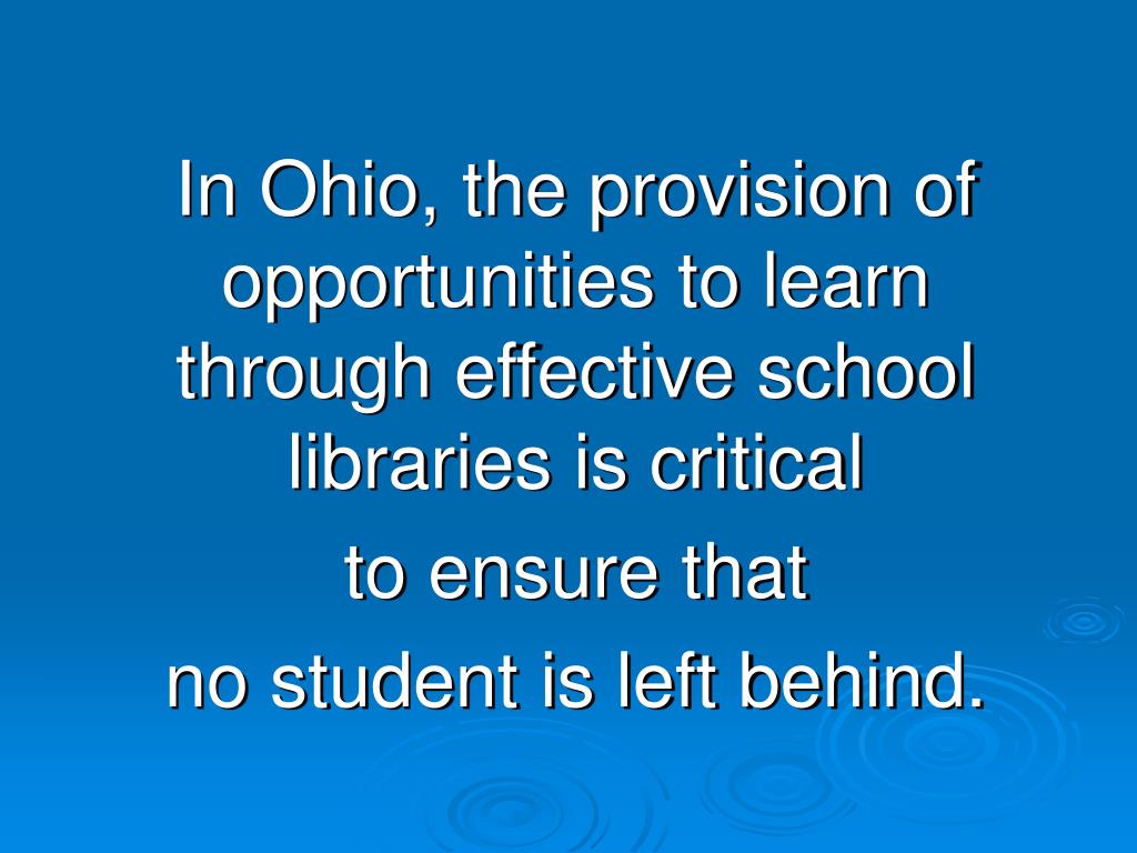 In Ohio, the provision of opportunities to learn through effective school libraries is critical to ensure that no student is left behind.