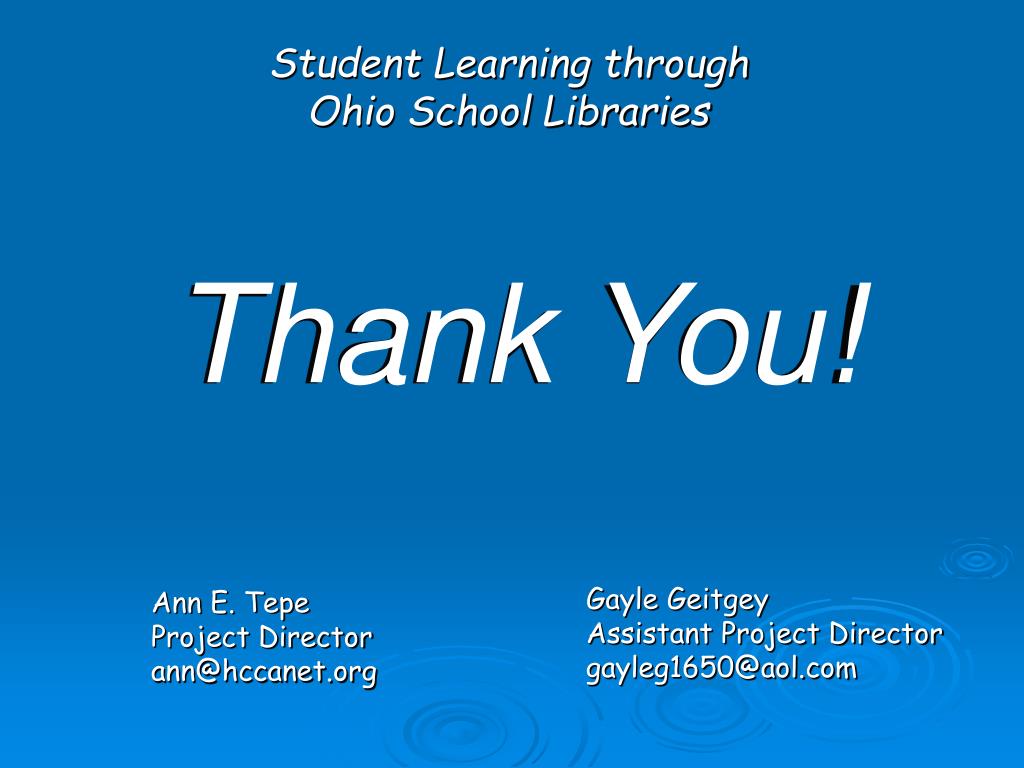 Student Learning through Ohio School Libraries Thank You! Gayle Geitgey Assistant Project Director gayleg1650@aol.com Ann E. Tepe Project Director ann@hccanet.org