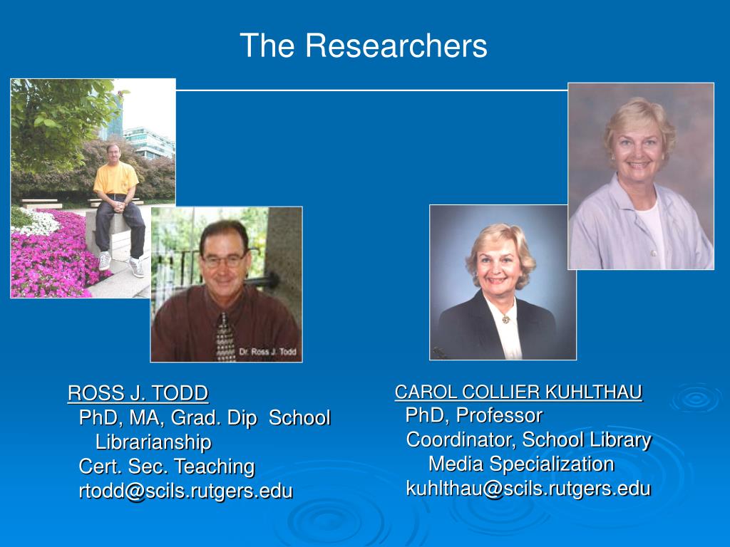 The Researchers ROSS J. TODD PhD, MA, Grad. Dip School Librarianship Cert. Sec. Teaching rtodd@scils.rutgers.edu CAROL COLLIER KUHLTHAU PhD, Professor Coordinator, School Library Media Specialization kuhlthau@scils.rutgers.edu