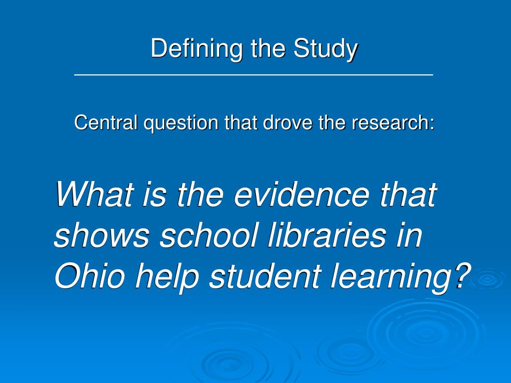 Defining the Study Central question that drove the research: What is the evidence that shows school libraries in Ohio help student learning?