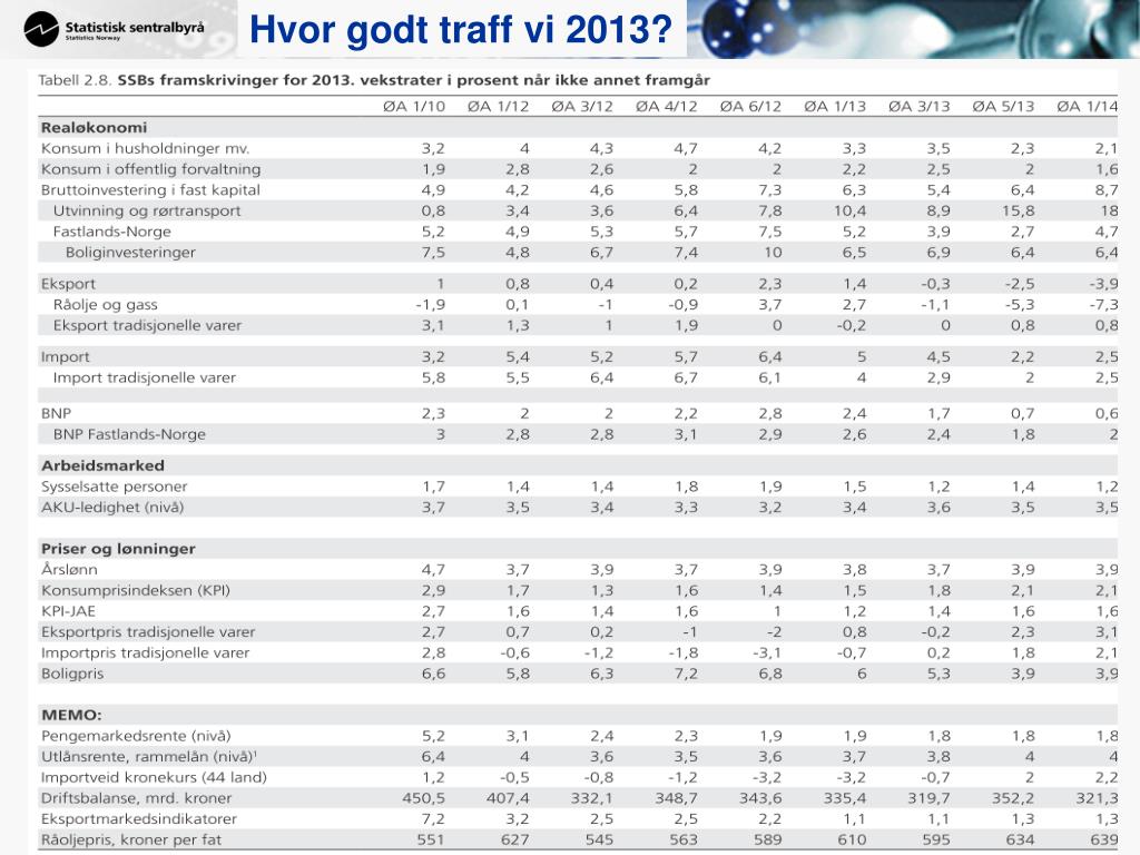 Økonomisk utsyn: Hvor mange jobber med utsynet og hva gjør de? • Perspektiver adm.dir + noen i forskning • Konjunkturtendensene makrogruppa • Utsynet over 2013 Mange i SSB, men mest forskning • 30-40 personer skriver og analyserer • Enda flere er direkte involvert i tallarbeid • Indirekte: Alle som lager statistikk i SSB