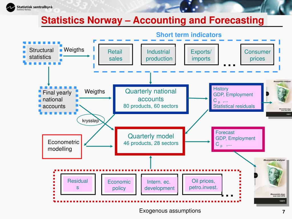 Statistics Norway – Accounting and Forecasting Short term indicators Weigths Structuralstatistics Retail sales Industrial production Exports/ imports Consumer prices ... History GDP, Employment C p ,... Statistical residuals Quarterly national accounts 80 products, 60 sectors Weigths Final yearly national accounts p kryssløp Forecast GDP, Employment C p ,... Quarterly model 46 products, 28 sectors Econometricmodelling Residuals Oil prices, petro.invest. Economic policy Intern. ec. development ... Exogenous assumptions
