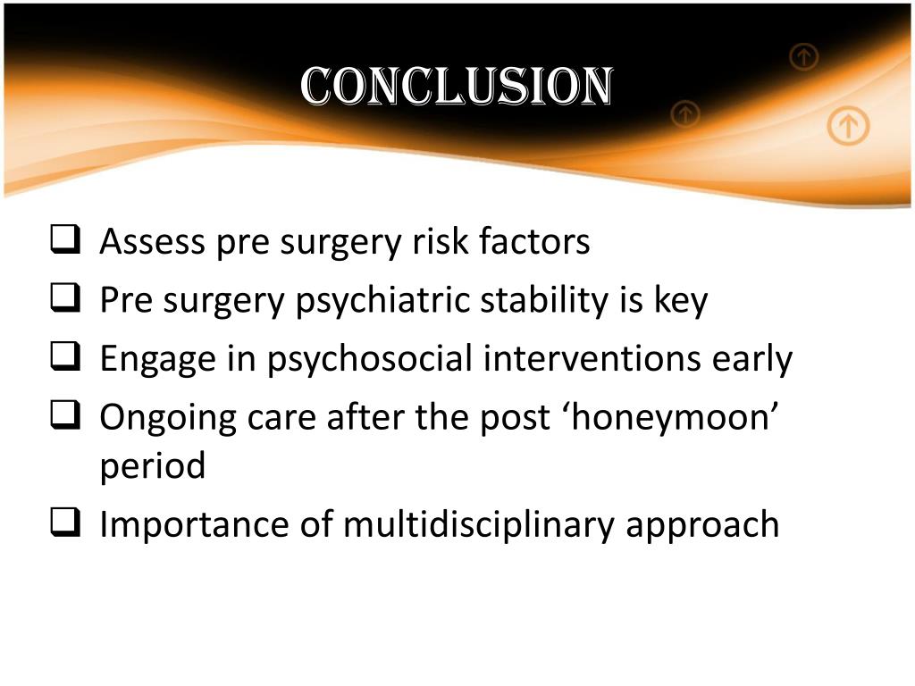 conclusion • Assesspresurgeryriskfactors • Presurgerypsychiatricstabilityiskey • Engage in psychosocial interventions early • Ongoing care after the post ‘honeymoon’ period • Importance of multidisciplinaryapproach