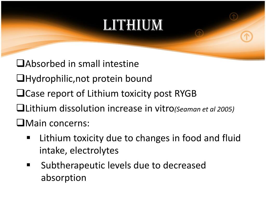 lITHIUM • Absorbed in small intestine • Hydrophilic,notproteinbound • Case report of Lithium toxicity post RYGB • Lithium dissolution increase in vitro(Seaman et al 2005) • Main concerns: • Lithium toxicity due to changes in food and fluidintake, electrolytes • Subtherapeuticlevels due to decreased absorption