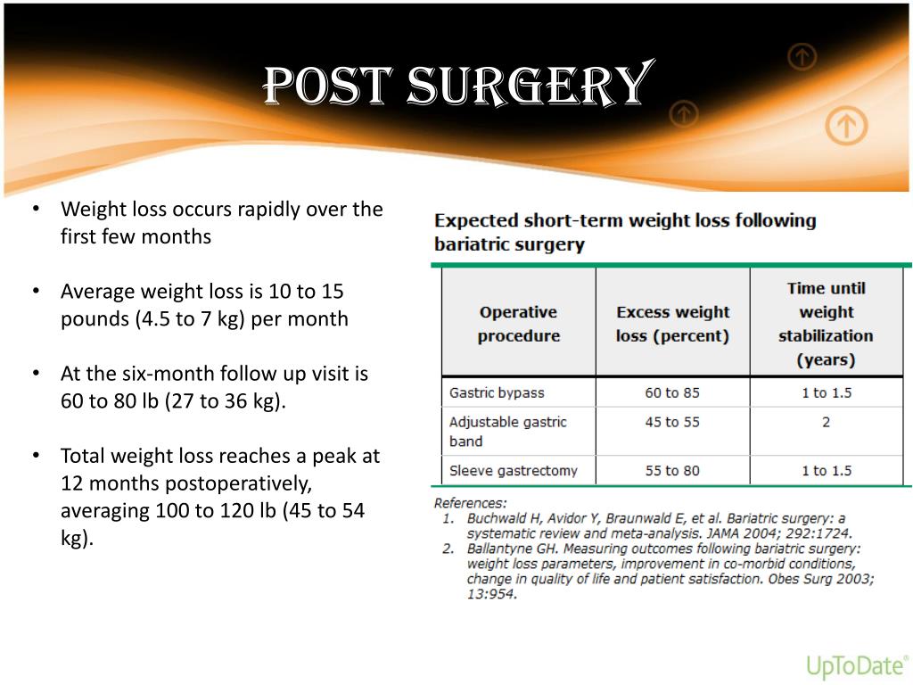POST SURGERY • Weight loss occurs rapidly over the first few months • Average weight loss is 10 to 15 pounds (4.5 to 7 kg) per month • At the six-month follow up visit is 60 to 80 lb (27 to 36 kg). • Total weight loss reaches a peak at 12 months postoperatively, averaging 100 to 120 lb (45 to 54 kg).