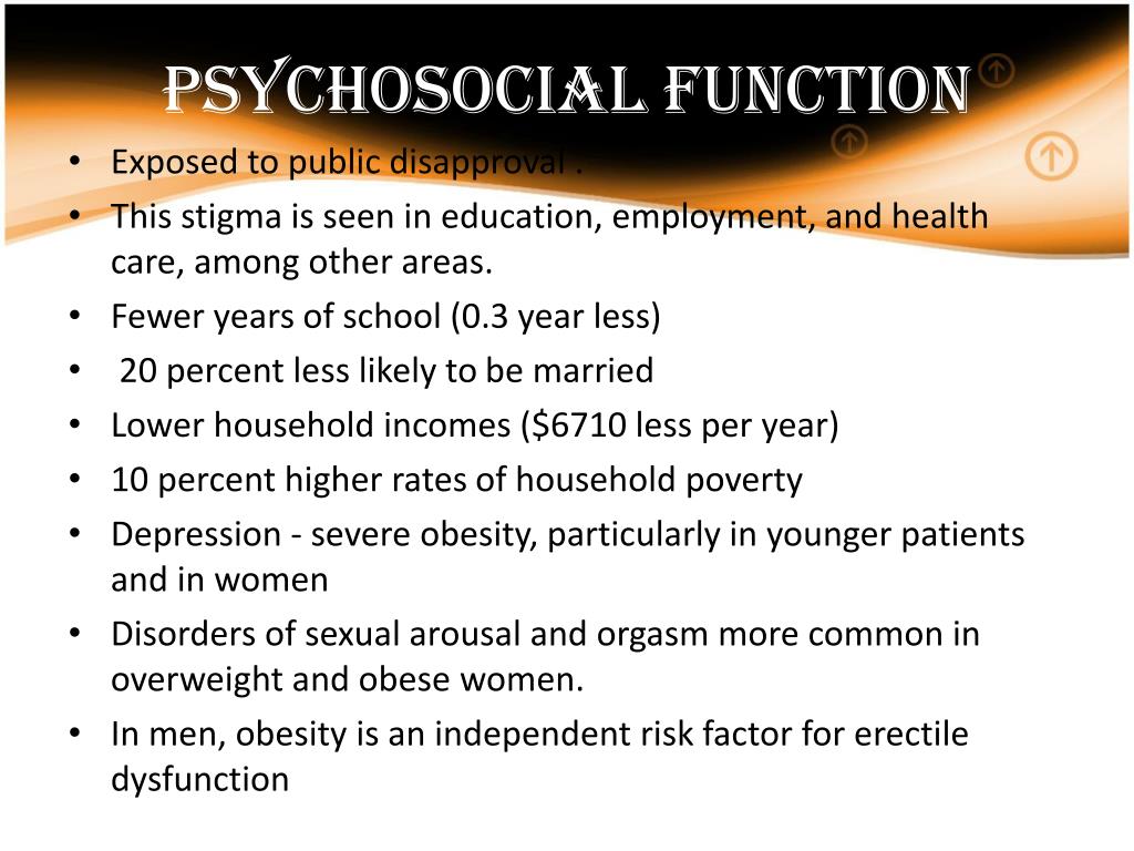 Psychosocial function • Exposed to public disapproval . • This stigma is seen in education, employment, and health care, among other areas. • Fewer years of school (0.3 year less) • 20 percent less likely to be married • Lower household incomes ($6710 less per year) • 10 percent higher rates of household poverty • Depression -severe obesity, particularly in younger patients and in women • Disorders of sexual arousal and orgasm more common in overweight and obese women. • In men, obesity is an independent risk factor for erectile dysfunction