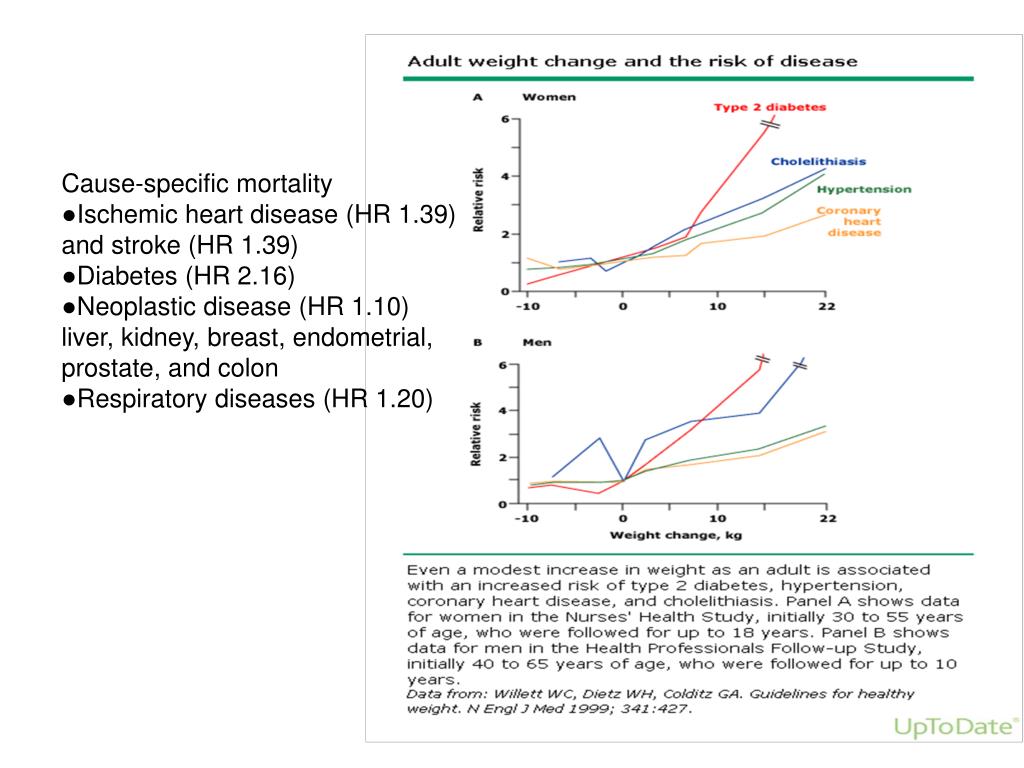 Cause-specific mortality ●Ischemic heart disease (HR 1.39) and stroke (HR 1.39) ●Diabetes (HR 2.16) ●Neoplastic disease (HR 1.10) liver, kidney, breast, endometrial, prostate, and colon ●Respiratory diseases (HR 1.20)