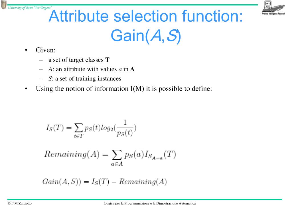Attribute selection function: Gain(A,S) • Given: • a set of target classes T • A: an attribute with values a in A • S: a set of training instances • Using the notion of information I(M) it is possible to define: