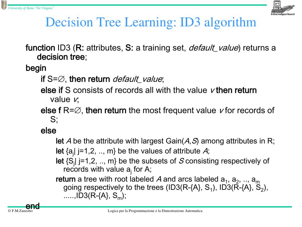 Decision Tree Learning: ID3 algorithm function ID3 (R: attributes, S: a training set, default_value) returns a decisiontree; begin if S=, thenreturndefault_value; else if S consists of recordsall with the valuev thenreturnvaluev; else f R=, thenreturnthe mostfrequentvaluev for records of S; else letA be the attribute with largest Gain(A,S) amongattributes in R; let{aj| j=1,2, .., m} be the values of attributeA; let{Sj| j=1,2, .., m} be the subsets of S consistingrespectively of records with valueaj for A; returna tree with rootlabeledA and arcslabeled a1, a2, .., amgoingrespectively to the trees (ID3(R-{A}, S1), ID3(R-{A}, S2), .....,ID3(R-{A}, Sm); end