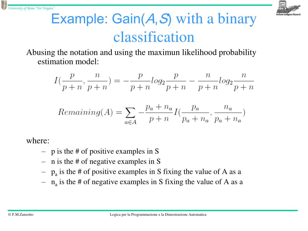 Example: Gain(A,S) with a binary classification Abusing the notation and using the maximunlikelihoodprobabilityestimation model: where: • p is the # of positive examples in S • n is the # of negative examples in S • pais the # of positive examples in S fixing the value of A as a • nais the # of negative examples in S fixing the value of A as a