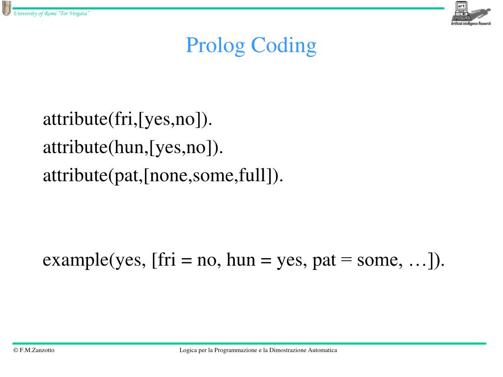 PrologCoding attribute(fri,[yes,no]). attribute(hun,[yes,no]). attribute(pat,[none,some,full]). example(yes, [fri = no, hun = yes, pat = some, …]).