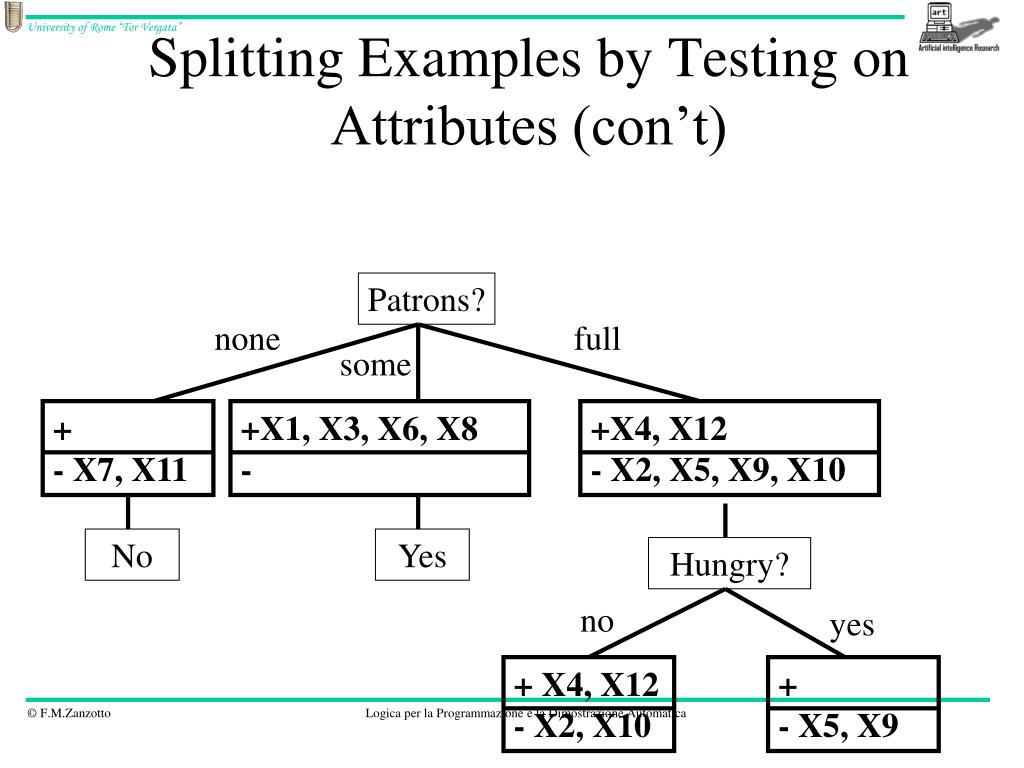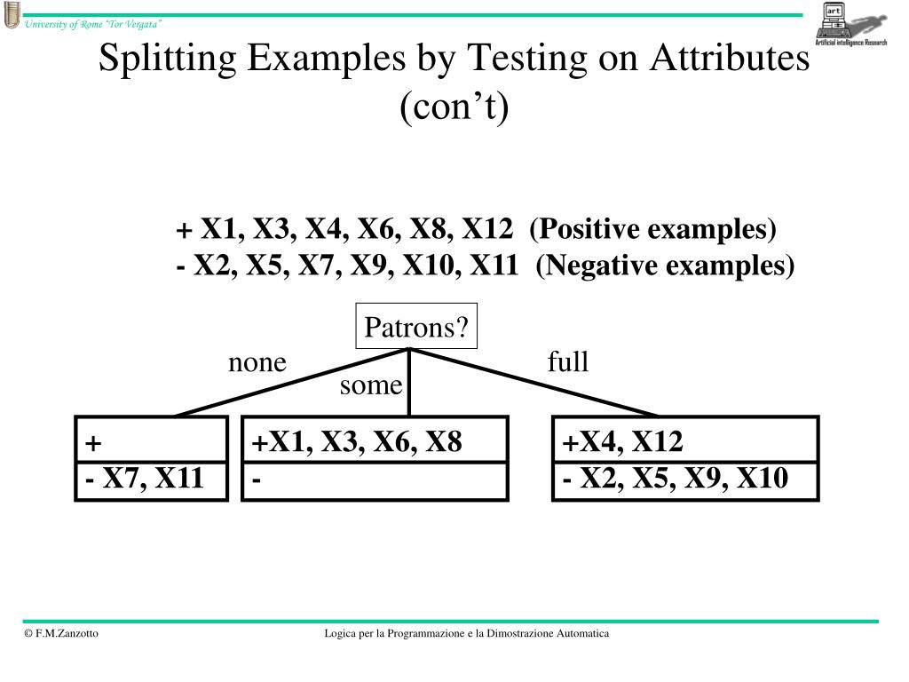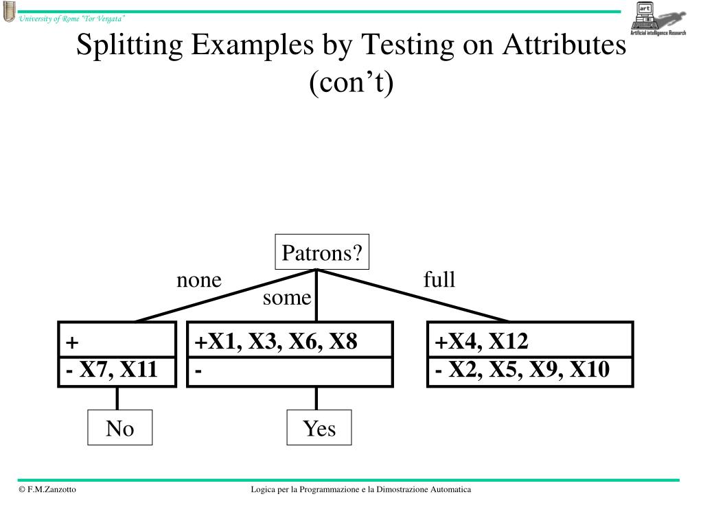 Splitting Examples by Testing on Attributes (con’t) + X1, X3, X4, X6, X8, X12 (Positive examples) - X2, X5, X7, X9, X10, X11 (Negative examples) Patrons? none full some + - X7, X11 +X1, X3, X6, X8 - +X4, X12 - X2, X5, X9, X10 No Yes