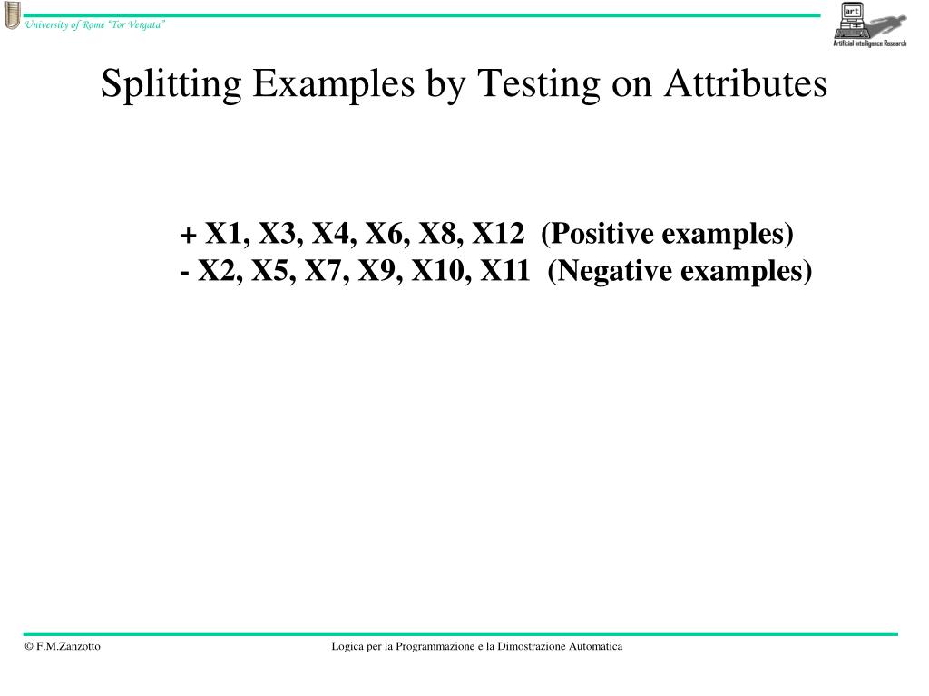 Splitting Examples by Testing on Attributes + X1, X3, X4, X6, X8, X12 (Positive examples) - X2, X5, X7, X9, X10, X11 (Negative examples)
