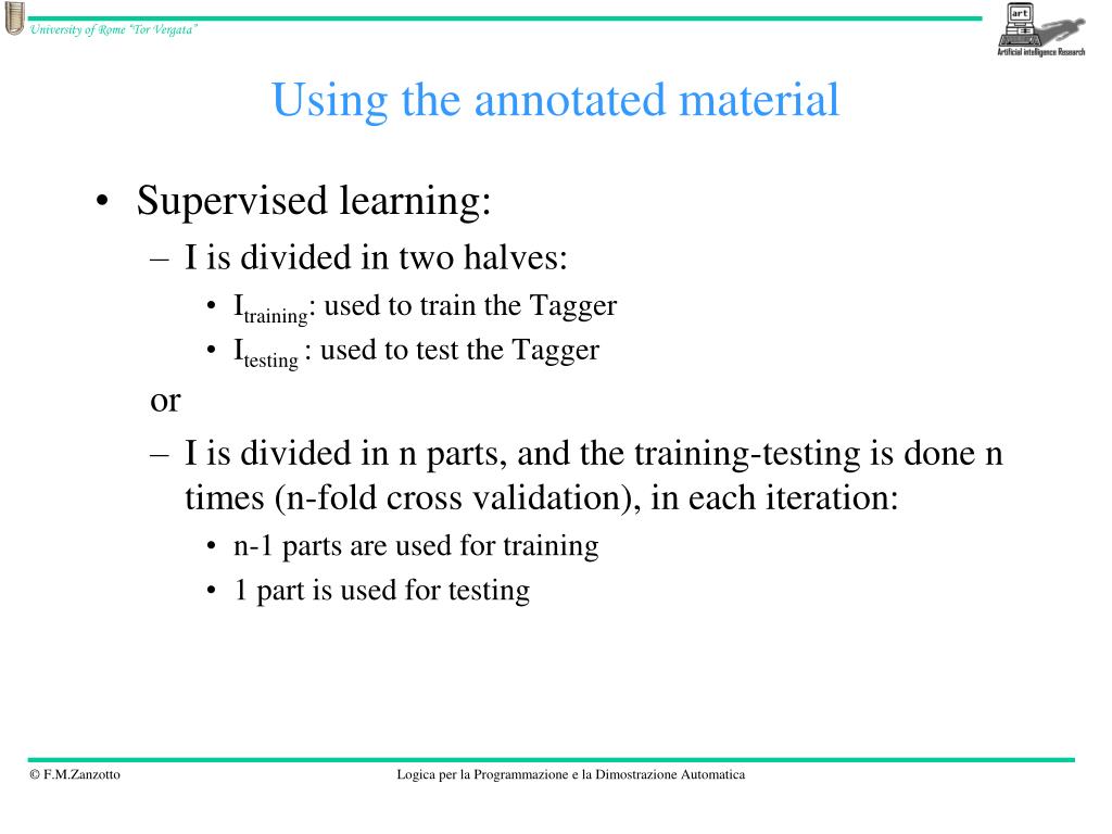 Using the annotated material • Supervised learning: • I is divided in two halves: • Itraining: used to train the Tagger • Itesting : used to test the Tagger or • I is divided in n parts, and the training-testing is done n times (n-fold cross validation), in each iteration: • n-1 parts are used for training • 1 part is used for testing