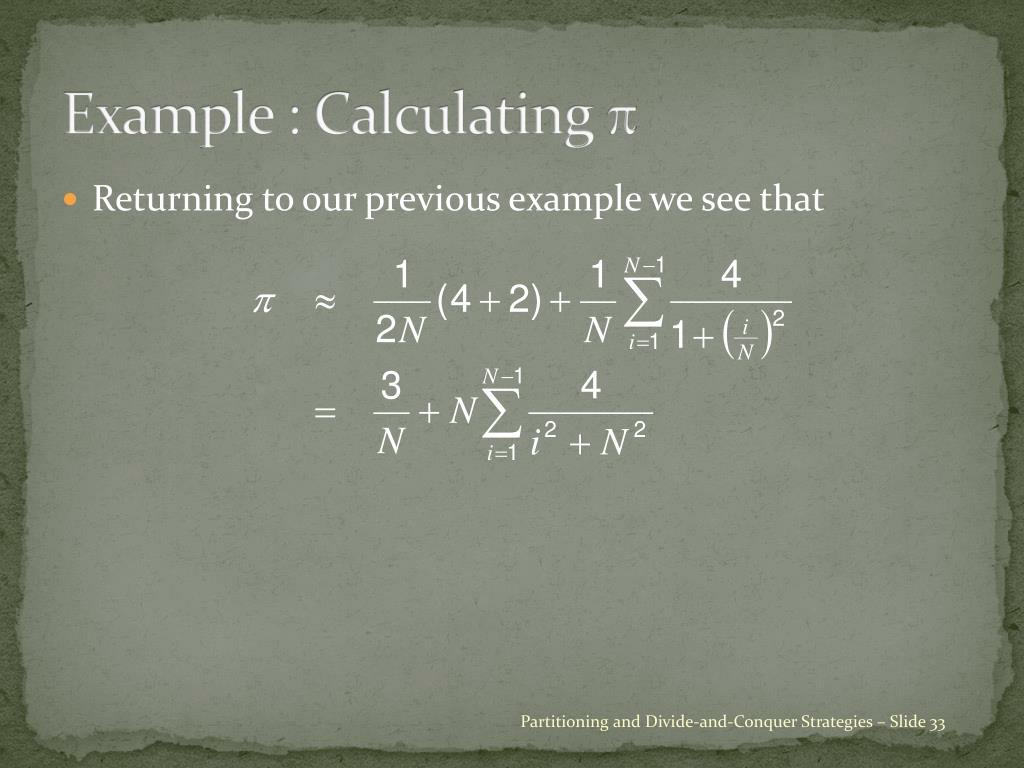 Example : Calculating • Returning to our previous example we see that Partitioning and Divide-and-Conquer Strategies – Slide 33