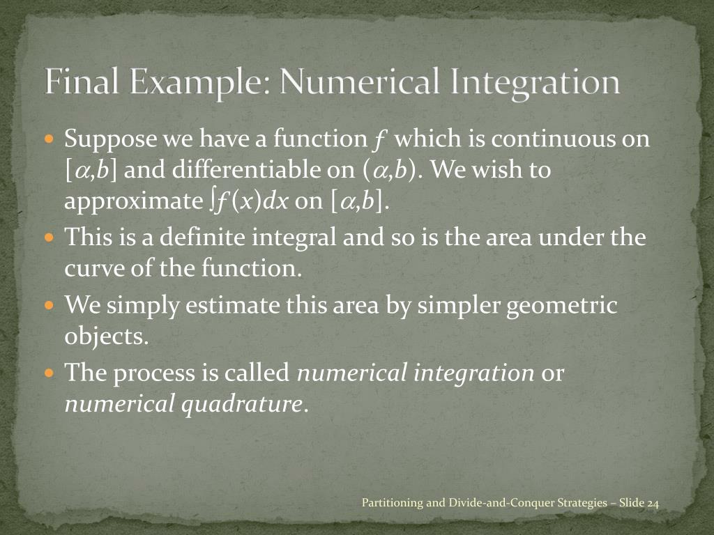 Final Example: Numerical Integration • Suppose we have a function ƒ which is continuous on [,b] and differentiable on (,b). We wish to approximate ƒ(x)dx on [,b]. • This is a definite integral and so is the area under the curve of the function. • We simply estimate this area by simpler geometric objects. • The process is called numerical integration or numerical quadrature. Partitioning and Divide-and-Conquer Strategies – Slide 24