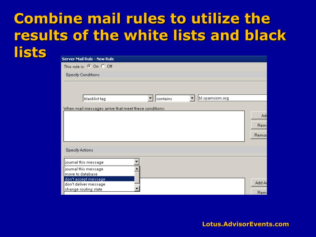 Combine General DNS Based Listswith Manual “Private” lists DNS based white lists – home grown or internal DNS DNS based Black lists like “spamcom” Private Manual list of additional hosts to block Private Manual list of hosts to allow though