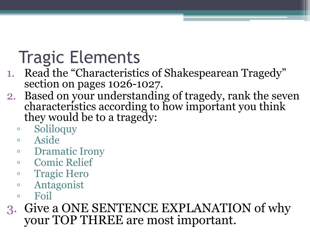 Tragic Elements • Read the “Characteristics of Shakespearean Tragedy” section on pages 1026-1027. • Based on your understanding of tragedy, rank the seven characteristics according to how important you think they would be to a tragedy: • Soliloquy • Aside • Dramatic Irony • Comic Relief • Tragic Hero • Antagonist • Foil • Give a ONE SENTENCE EXPLANATION of why your TOP THREE are most important.