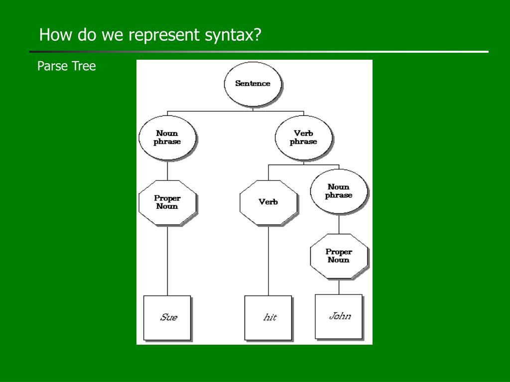 How do we represent syntax? • List • Sue hit John • [ s, [np, [proper_noun, Sue] ] , • [vp, [v, hit], • [np, [proper_noun, John] ]