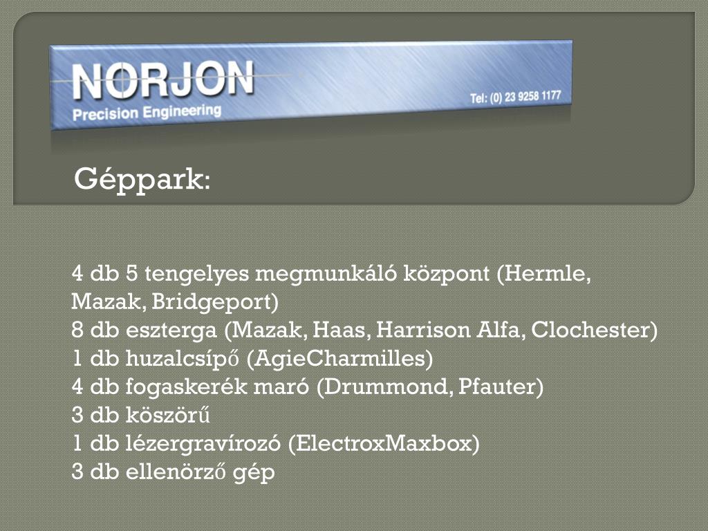 Géppark: 4 db 5 tengelyes megmunkáló központ (Hermle, Mazak, Bridgeport) 8 db eszterga (Mazak, Haas, Harrison Alfa, Clochester) 1 db huzalcsípő (AgieCharmilles) 4 db fogaskerék maró (Drummond, Pfauter) 3 db köszörű 1 db lézergravírozó (ElectroxMaxbox) 3 db ellenörző gép