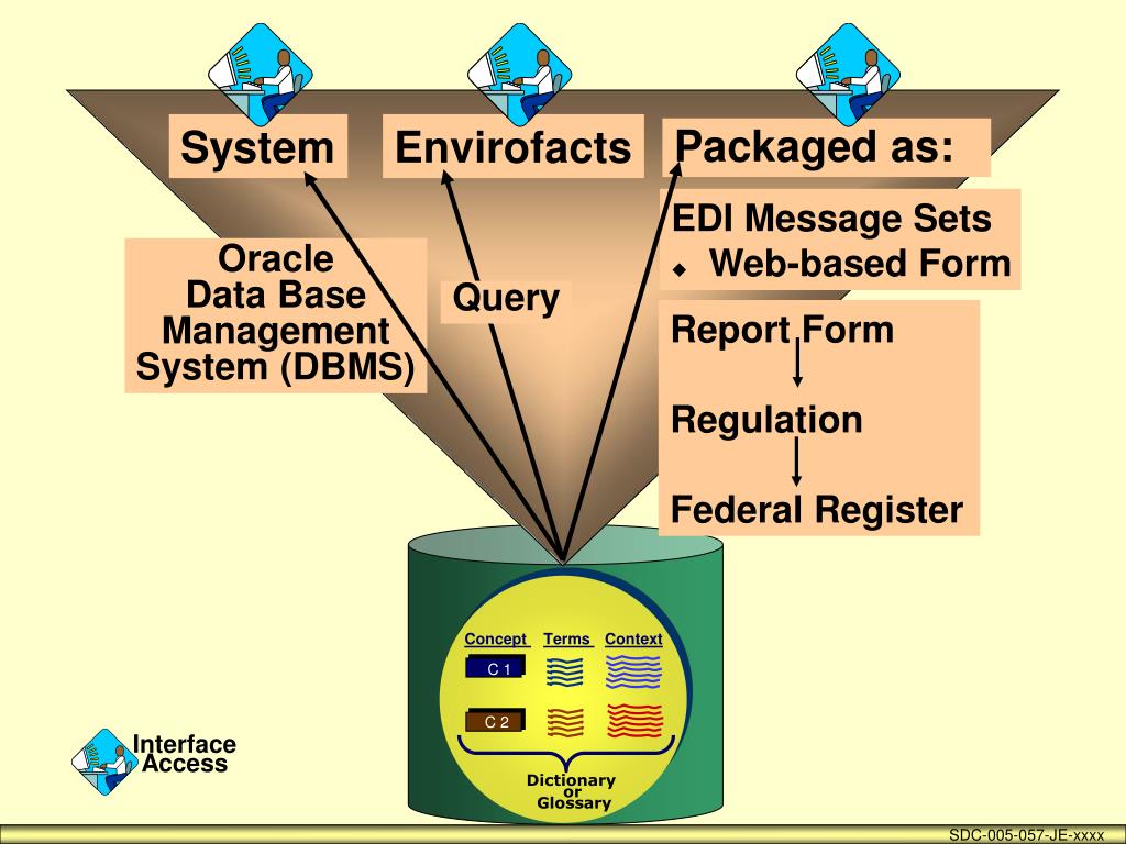 System Envirofacts Packaged as: EDI Message Sets - Web-enabled Form Oracle Data Base Management System (DBMS) Query Report Forms Regulation Federal Register Concept Terms Context C 1 C 2 Interface Access Dictionary or Glossary