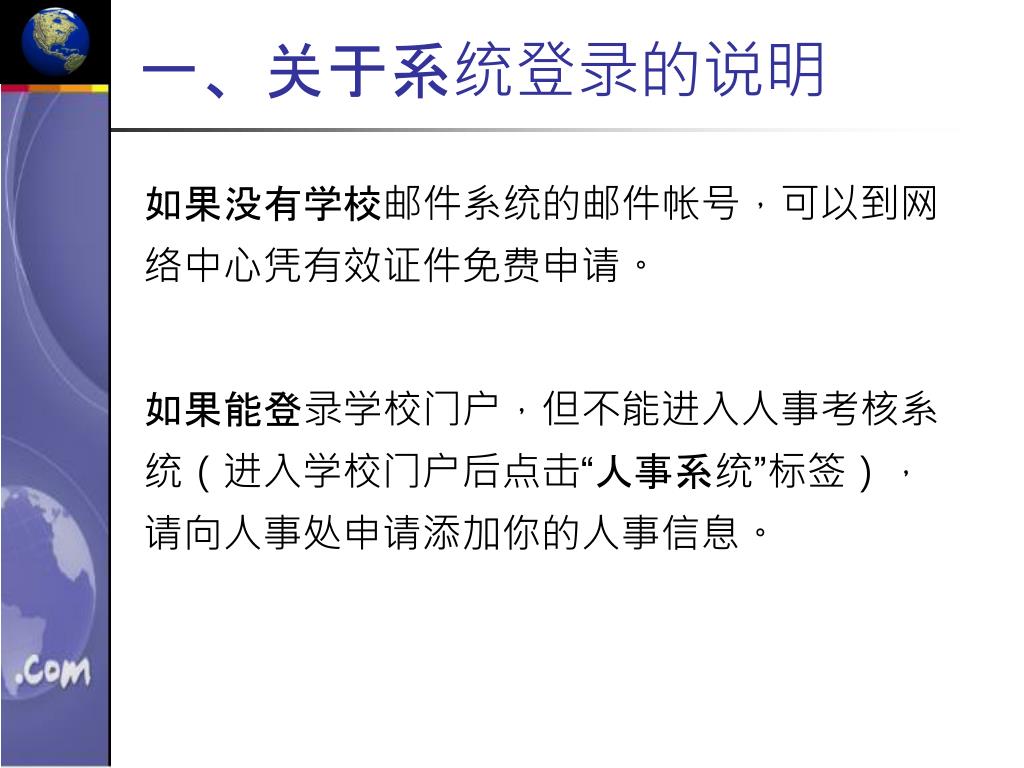 一、关于系统登录的说明 如果没有学校邮件系统的邮件帐号,可以到网络中心凭有效证件免费申请。 如果能登录学校门户,但不能进入人事考核系统(进入学校门户后点击“人事系统”标签),请向人事处申请添加你的人事信息。