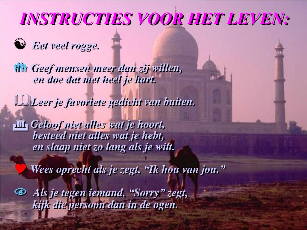 INSTRUCTIES VOOR HET LEVEN: • Eet veel rogge. • Geef mensen meer dan zij willen,en doe dat met heel je hart. • Leer je favoriete gedicht van buiten. • Geloof niet alles wat je hoort,besteed niet alles wat je hebt,en slaap niet zo lang als je wilt. • Wees oprecht als je zegt, “Ik hou van jou.” • Als je tegen iemand, “Sorry” zegt, kijk die persoon dan in de ogen.