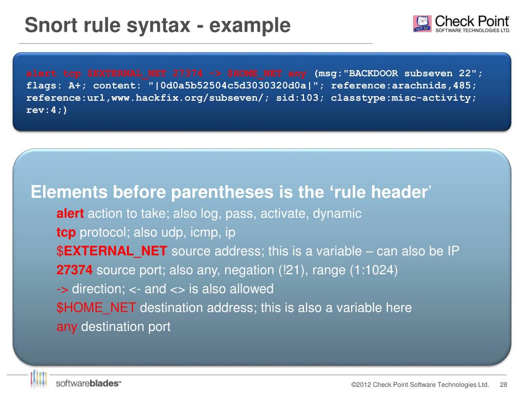 Snort rule syntax - example alert tcp $EXTERNAL_NET 27374 -> $HOME_NET any (msg:"BACKDOOR subseven 22"; flags: A+; content: "|0d0a5b52504c5d3030320d0a|"; reference:arachnids,485; reference:url,www.hackfix.org/subseven/; sid:103; classtype:misc-activity; rev:4;) Elements before parentheses is the ‘rule header’ alert action to take; also log, pass, activate, dynamic tcpprotocol; also udp, icmp, ip $EXTERNAL_NET source address; this is a variable – can also be IP 27374source port; also any, negation (!21), range (1:1024) -> direction; <- and <> is also allowed $HOME_NET destination address; this is also a variable here any destination port