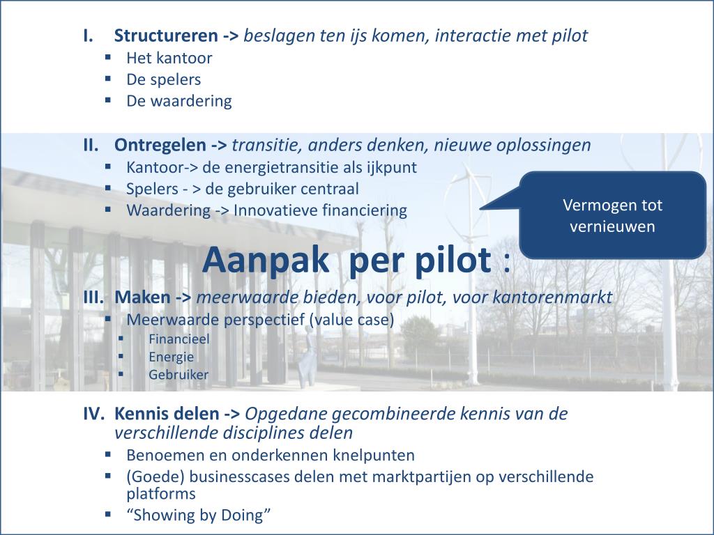 Structureren -> beslagen ten ijs komen, interactie met pilot • Het kantoor • De spelers • De waardering • Ontregelen -> transitie, anders denken, nieuwe oplossingen • Kantoor-> de energietransitie als ijkpunt • Spelers - > de gebruiker centraal • Waardering -> Innovatieve financiering • Maken -> meerwaarde bieden, voor pilot, voor kantorenmarkt • Meerwaarde perspectief (value case) • Financieel • Energie • Gebruiker • Kennis delen -> Opgedane gecombineerde kennis van de verschillende disciplines delen • Benoemen en onderkennen knelpunten • (Goede) businesscases delen met marktpartijen op verschillende platforms • “ShowingbyDoing” Vermogen tot vernieuwen Aanpak per pilot: