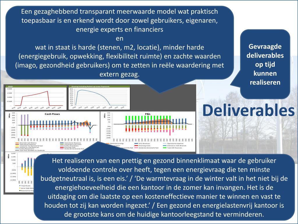 Een gezaghebbend transparant meerwaarde model wat praktisch toepasbaar is en erkend wordt door zowel gebruikers, eigenaren, energie experts en financiers enwat in staat is harde (stenen, m2, locatie), minder harde (energiegebruik, opwekking, flexibiliteit ruimte) en zachte waarden (imago, gezondheid gebruikers) om te zetten in reële waardering met extern gezag. Gevraagde deliverables op tijd kunnen realiseren Deliverables Het realiseren van een prettig en gezond binnenklimaat waar de gebruiker voldoende controle over heeft, tegen een energievraag die ten minste budgetneutraal is, is een eis.’ / ‘De warmtevraag in de winter valt in het niet bij de energiehoeveelheid die een kantoor in de zomer kan invangen. Het is de uitdaging om die laatste op een kosteneffectieve manier te winnen en vast te houden tot zij kan worden ingezet.’ / Een gezond en energielastenvrij kantoor is de grootste kans om de huidige kantoorleegstand te verminderen.