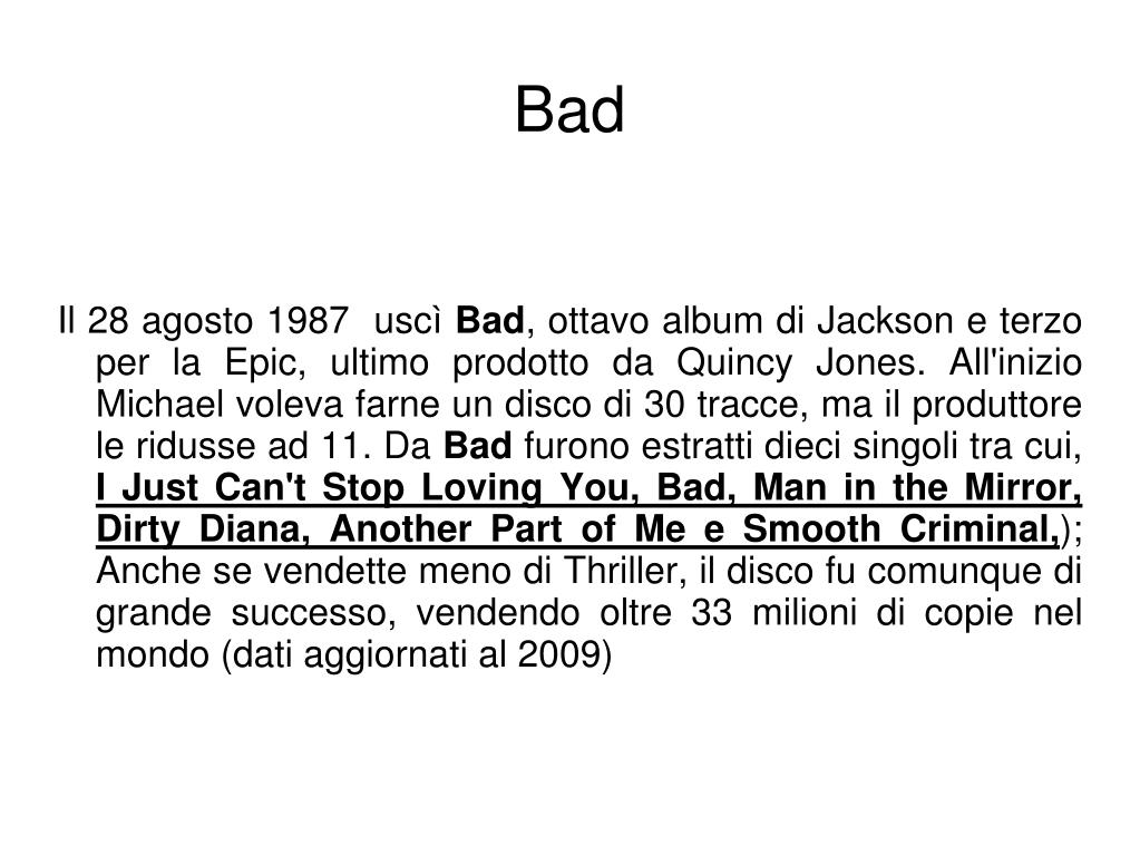 Il 28 agosto 1987 uscì Bad, ottavo album di Jackson e terzo per la Epic, ultimo prodotto da Quincy Jones. All'inizio Michael voleva farne un disco di 30 tracce, ma il produttore le ridusse ad 11. Da Bad furono estratti dieci singoli tra cui, I Just Can't Stop Loving You, Bad, Man in the Mirror, Dirty Diana, Another Part of Me e Smooth Criminal,); Anche se vendette meno di Thriller, il disco fu comunque di grande successo, vendendo oltre 33 milioni di copie nel mondo (dati aggiornati al 2009) Bad