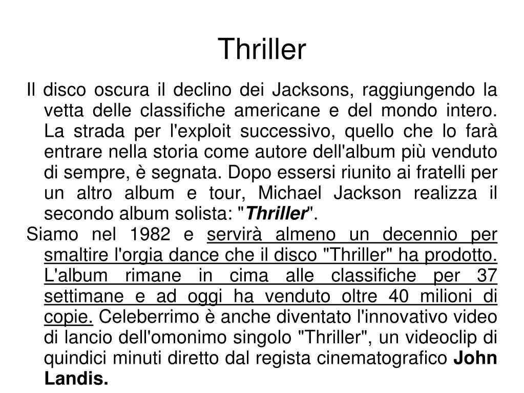 Il disco oscura il declino dei Jacksons, raggiungendo la vetta delle classifiche americane e del mondo intero. La strada per l'exploit successivo, quello che lo farà entrare nella storia come autore dell'album più venduto di sempre, è segnata. Dopo essersi riunito ai fratelli per un altro album e tour, Michael Jackson realizza il secondo album solista: "Thriller". Siamo nel 1982 e servirà almeno un decennio per smaltire l'orgia dance che il disco "Thriller" ha prodotto. L'album rimane in cima alle classifiche per 37 settimane e ad oggi ha venduto oltre 40 milioni di copie. Celeberrimo è anche diventato l'innovativo video di lancio dell'omonimo singolo "Thriller", un videoclip di quindici minuti diretto dal regista cinematografico John Landis. Thriller