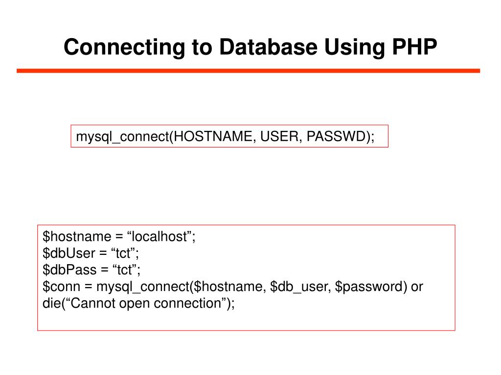 Connecting to Database Using PHP mysql_connect(HOSTNAME, USER, PASSWD); $hostname = “localhost”; $dbUser = “tct”; $dbPass = “tct”; $conn = mysql_connect($hostname, $db_user, $password) or die(“Cannot open connection”);