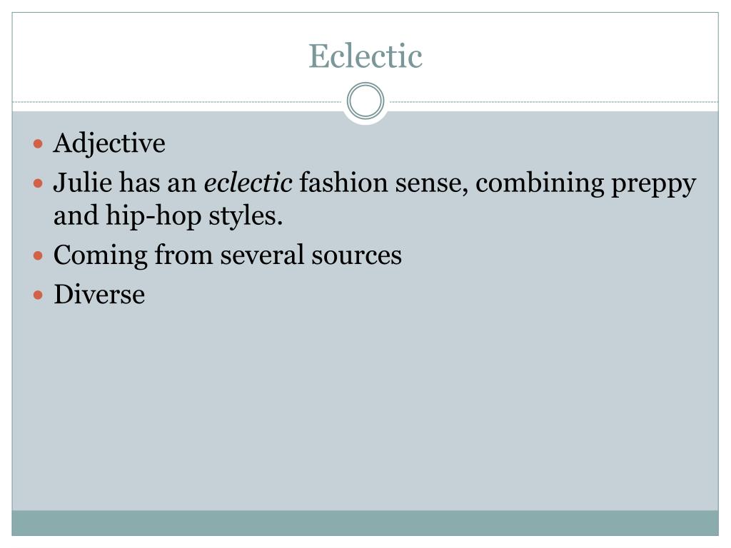 Eclectic Adjective Julie has an eclectic fashion sense, combining preppy and hip-hop styles. Coming from several sources Diverse