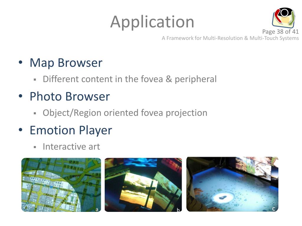 Application • Map Browser • Different content in the fovea & peripheral • Photo Browser • Object/Region oriented fovea projection • Emotion Player • Interactive art c